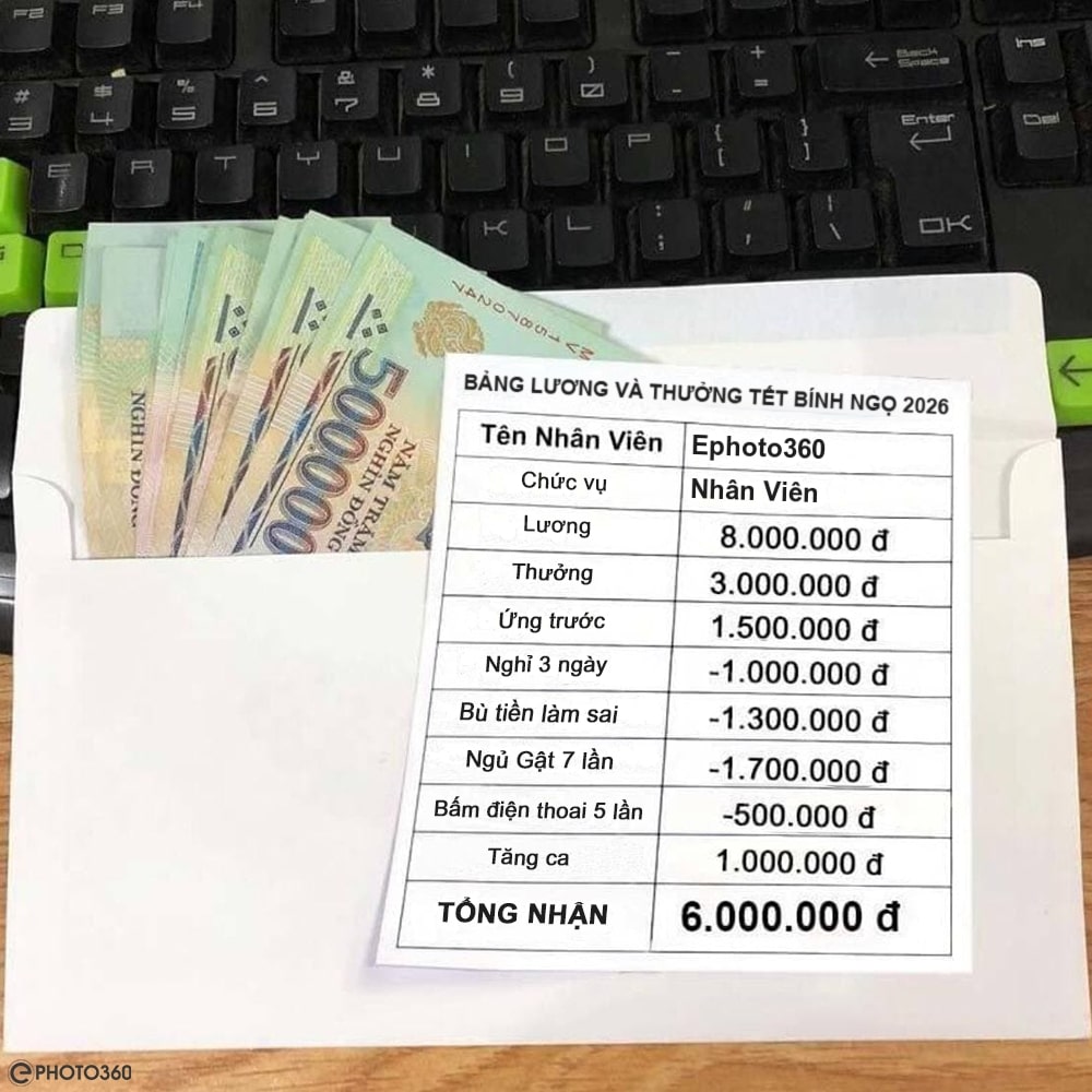 Làm ảnh chế bảng lương thưởng Tết Bính Ngọ mẫu mới nhất 2026. Tạo ảnh chế thưởng Tết 2026 online hài hước cho bạn tạo ra những hình ảnh chế thưởng tết đẹp ấn tượng chia sẻ đến bạn bè và người thân trên MXH. Những ngày cận Tết, chủ đề lương và thưởng Tết là đề tài hot để những tấm ảnh chế lương và thưởng Tết Bính Ngọ 2026 online của Ephoto360 ra đời.