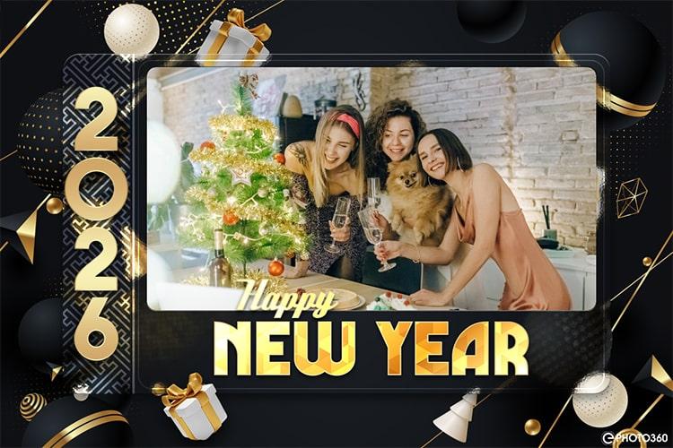 Mẫu khung ảnh năm mới 2026 sang trọng với tông đen vàng hiện đại, kết hợp hiệu ứng quà tặng, bóng bay và họa tiết lấp lánh. Khung ảnh nổi bật với kiểu chữ 3D ánh kim và không gian dành cho ảnh cá nhân, phù hợp để tạo thiệp chúc mừng, bài đăng mạng xã hội hoặc khoảnh khắc sum họp dịp năm mới.